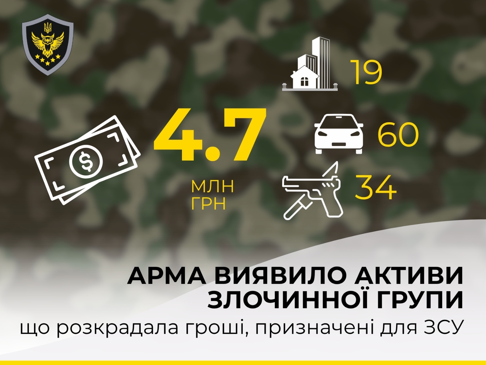 У ході проведених заходів АРМА виявило у підозрюваних об’єкти нерухомості, транспортні засоби, зброю, а також понад 4,7 млн грн на банківських рахунках.