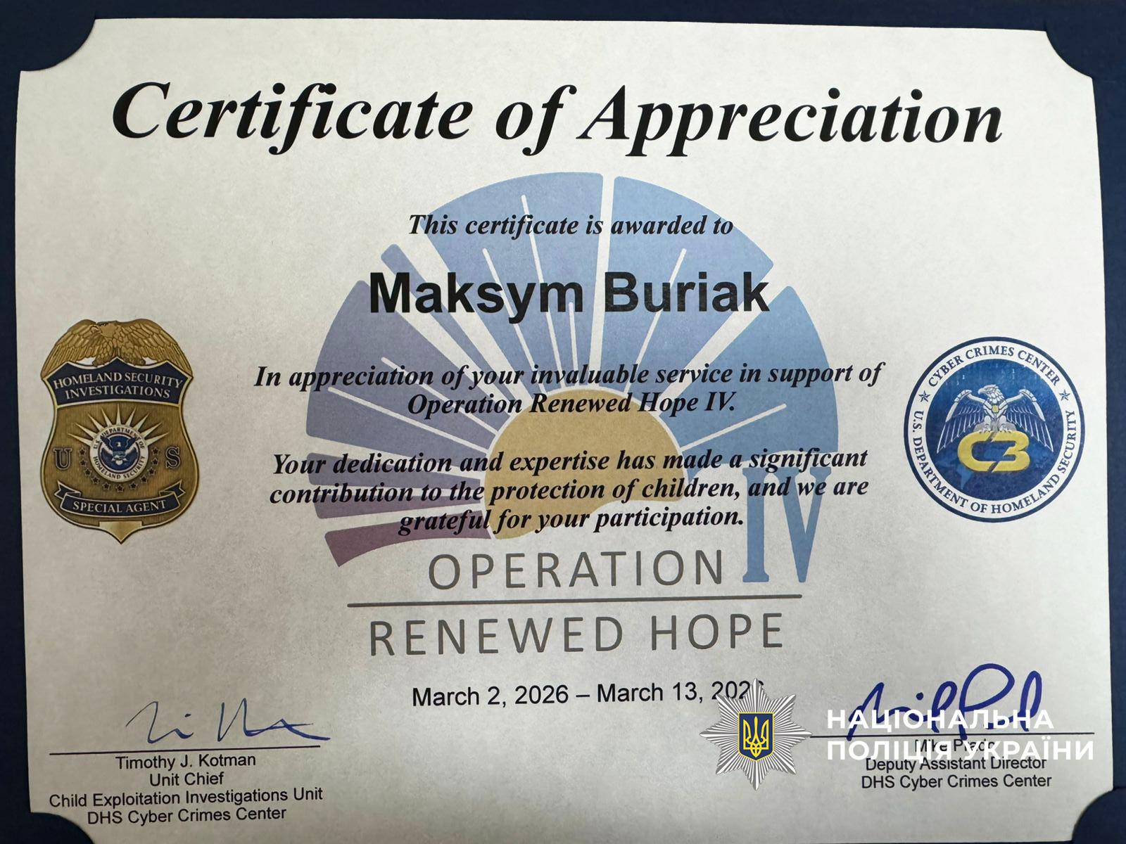 Запорізький кіберполіцейський Максим Буряк взяв участь в операції з ідентифікації жертв сексуального насильства над дітьми в Інтернеті. До заходу також долучилися колеги з Австрії, Австралії, Бельгії, Болгарії, Бразилії, Канади, Швейцарії, Колумбії, Данії, Еквадору, Естонії, Франції, Німеччини, Фінляндії, Молдови, Нідерландів, Польщі, Греції, Ірландії, Італії, Латвії, Норвегії, Португалії, Румунії, Іспанії, Швеції, Таїланду, Великої Британії, а також представниками Інтерполу, Європолу та Міністерства внутрішньої безпеки США.