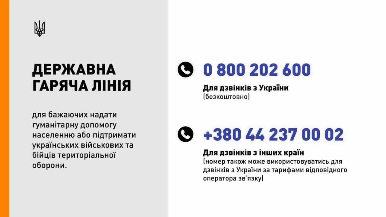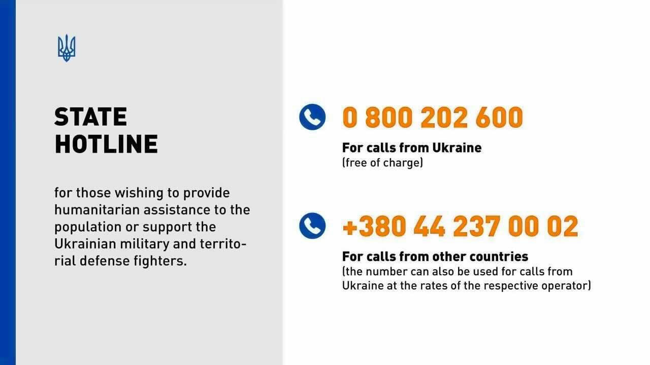 State hotline for those wishing to provide humanitarian assistance to the population or support the Ukrainian military and territorial defense fighters.