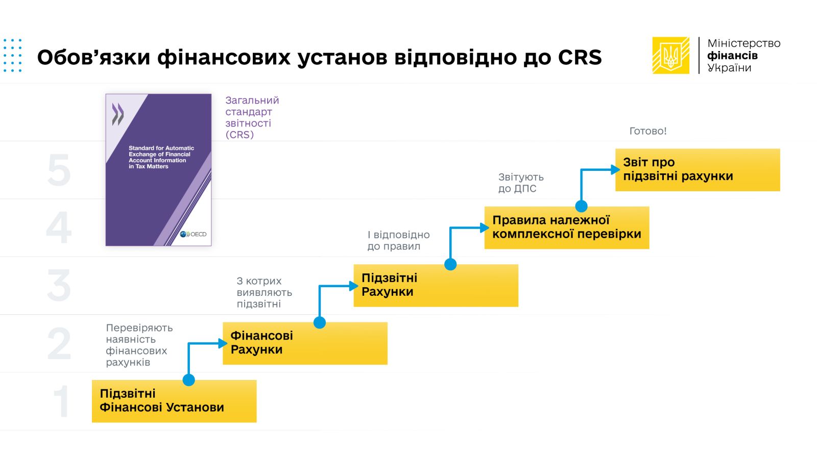 Запровадження міжнародного обміну інформацією відповідно до Загального стандарту звітності CRS є одним з пріоритетів Міністерства фінансів у податковій сфері, для реалізації якого залучено всебічну підтримку Глобального форуму з прозорості та обміну інформацією для податкових цілей (Глобальний форум ОЕСР) та Програми Європейського Союзу з підтримки управління державними фінансами в Україні (EU4PFM).
