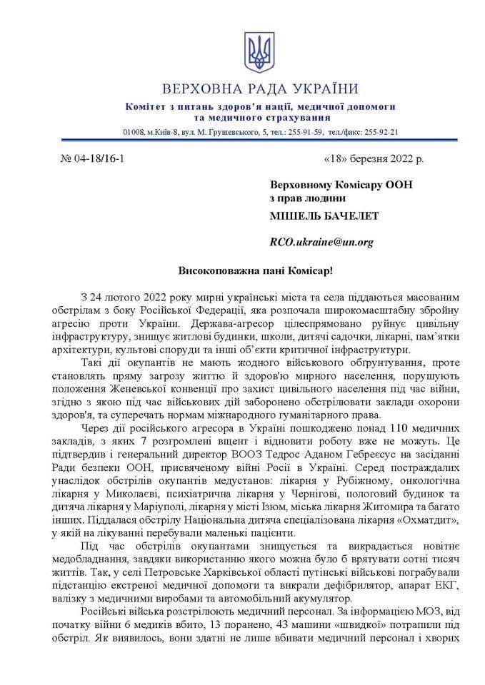 У першому листі, адресованому до Верховного комісара ООН з прав людини Мішеля Бачелета, Михайло Радуцький звернув увагу на те, що окупанти цілеспрямовано руйнують цивільну інфраструктуру, в тому числі й медичну.