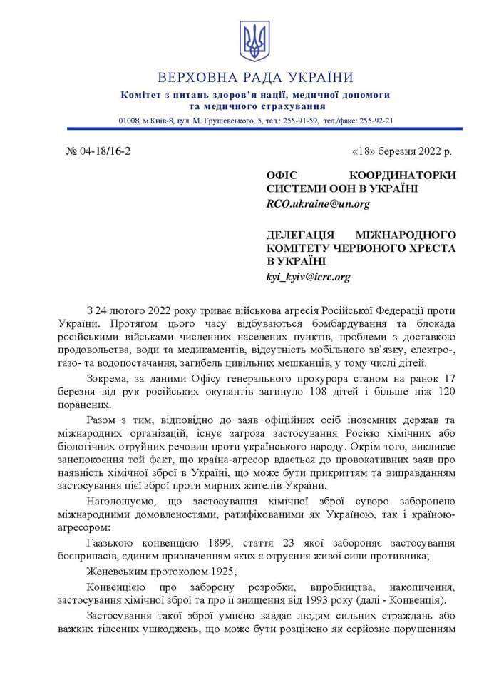 Голова Комітету з питань здоров’я нації зазначив, що відповідно до заяв офіційних осіб іноземних держав та міжнародних організацій існує загроза, що Росія застосує хімічну або біологічну зброю проти українців.