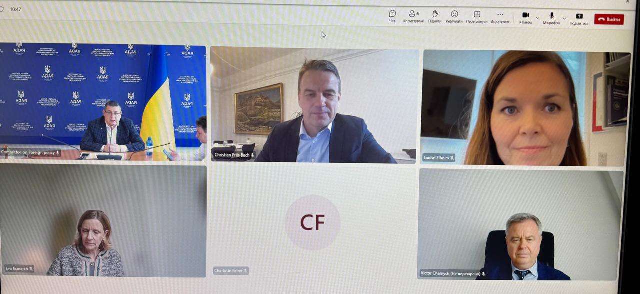 28 травня відбулася зустріч Голови Комітету з питань зовнішньої політики та міжпарламентського співробітництва О.Мережка та членів Комітету з Головою Комітету у закордонних справах Фолькетингу (Парламенту) Данії К.Ф. Бахом та членами Комітету в режимі відео конференції.