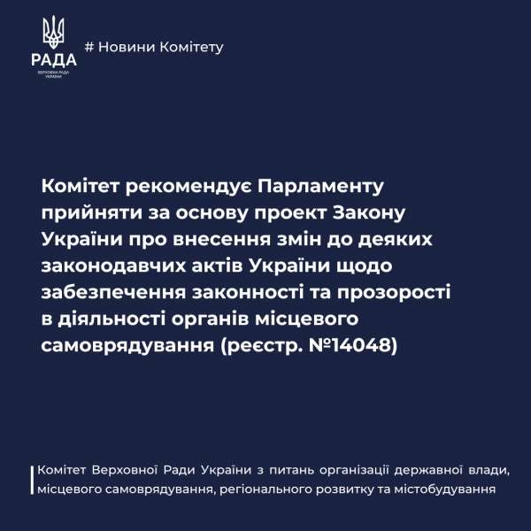 Комітет з питань організації державної влади, місцевого самоврядування, регіонального розвитку та містобудування на своєму засіданні 6 жовтня 2025 року розглянув проект Закону України про внесення змін до деяких законодавчих актів України щодо забезпечення законності та прозорості в діяльності органів місцевого самоврядування (реєстр. №14048), поданий народним депутатом України В.Безгіним та ін.