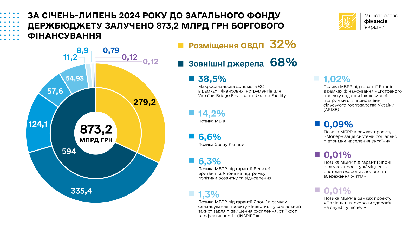 Фактичні державні запозичення до загального фонду державного бюджету за січень – липень 2024 року становили 873,2 млрд грн, з яких від розміщення ОВДП на фінансування держбюджету спрямовано 279,2 млрд грн (32% від загального обсягу).
