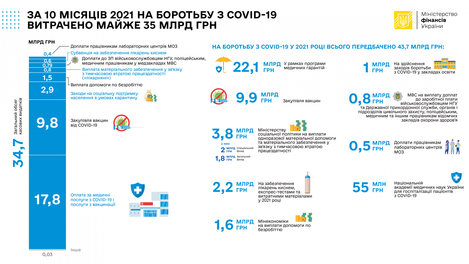За 11 місяців 2021 року загальні видатки коштів держбюджету на протидію пандемії COVID-19 становили 34,7 млрд грн з передбачених 43,7 млрд гривень. Зокрема, кошти витрачено на такі цілі: