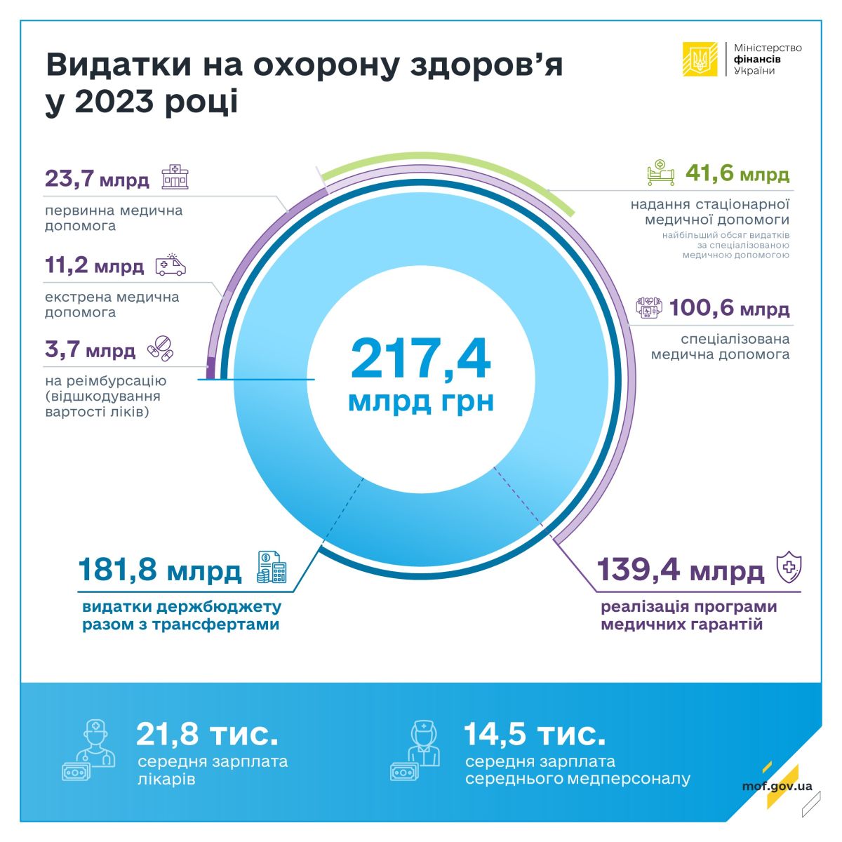 «У 2023 році Уряд забезпечив безперебійне фінансування сфери охорони здоров’я. Стабільне фінансуванню програми медичних гарантій дозволило своєчасно виплачувати заробітну плату понад 500 тис. медпрацівникам. Так, минулого року середня заробітна плата лікарів становила 21,8 тис. грн та середнього медичного персоналу – 14,5 тис. гривень. Продовжуємо і надалі вживати всі можливі заходи для своєчасного доступу населення до необхідної медичної допомоги та забезпечення ефективного функціонування системи охорони здоров’я в Україні», ‒ прокоментував заступник Міністра фінансів Роман Єрмоличев.