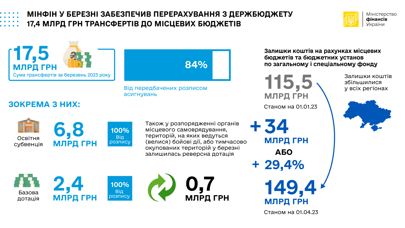 У березні 2023 року Уряд України згідно з бюджетним законодавством забезпечив перерахування міжбюджетних трансфертів місцевим бюджетам в обсязі 17,5 млрд грн, що становить 84 % від передбачених розписом асигнувань, зокрема: