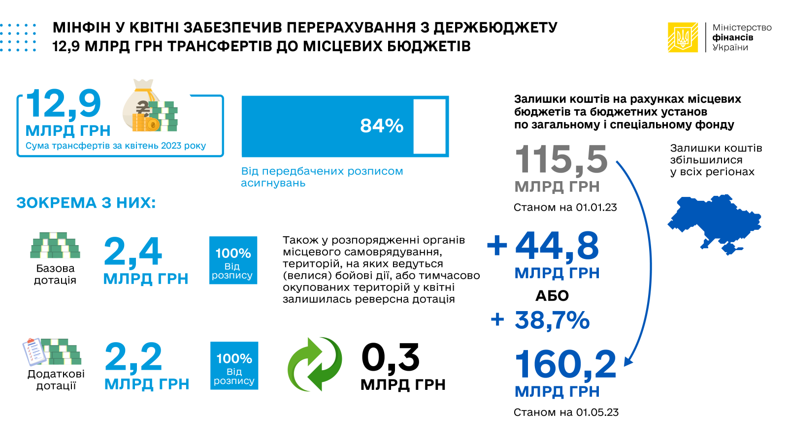 У квітні 2023 року Уряд України згідно з бюджетним законодавством забезпечив перерахування міжбюджетних трансфертів місцевим бюджетам в обсязі 12,9 млрд грн, що становить 84 % від передбачених розписом асигнувань, зокрема: