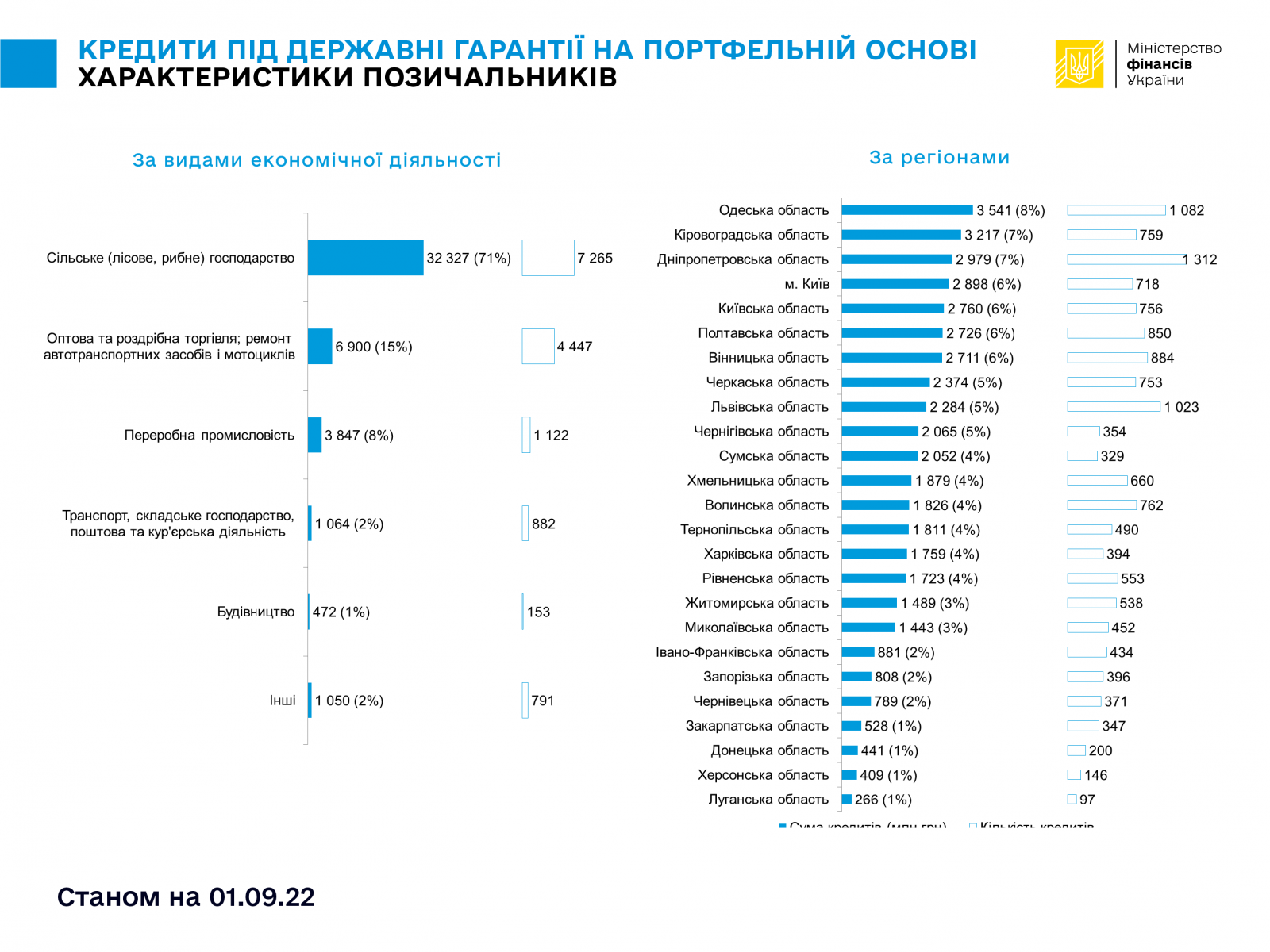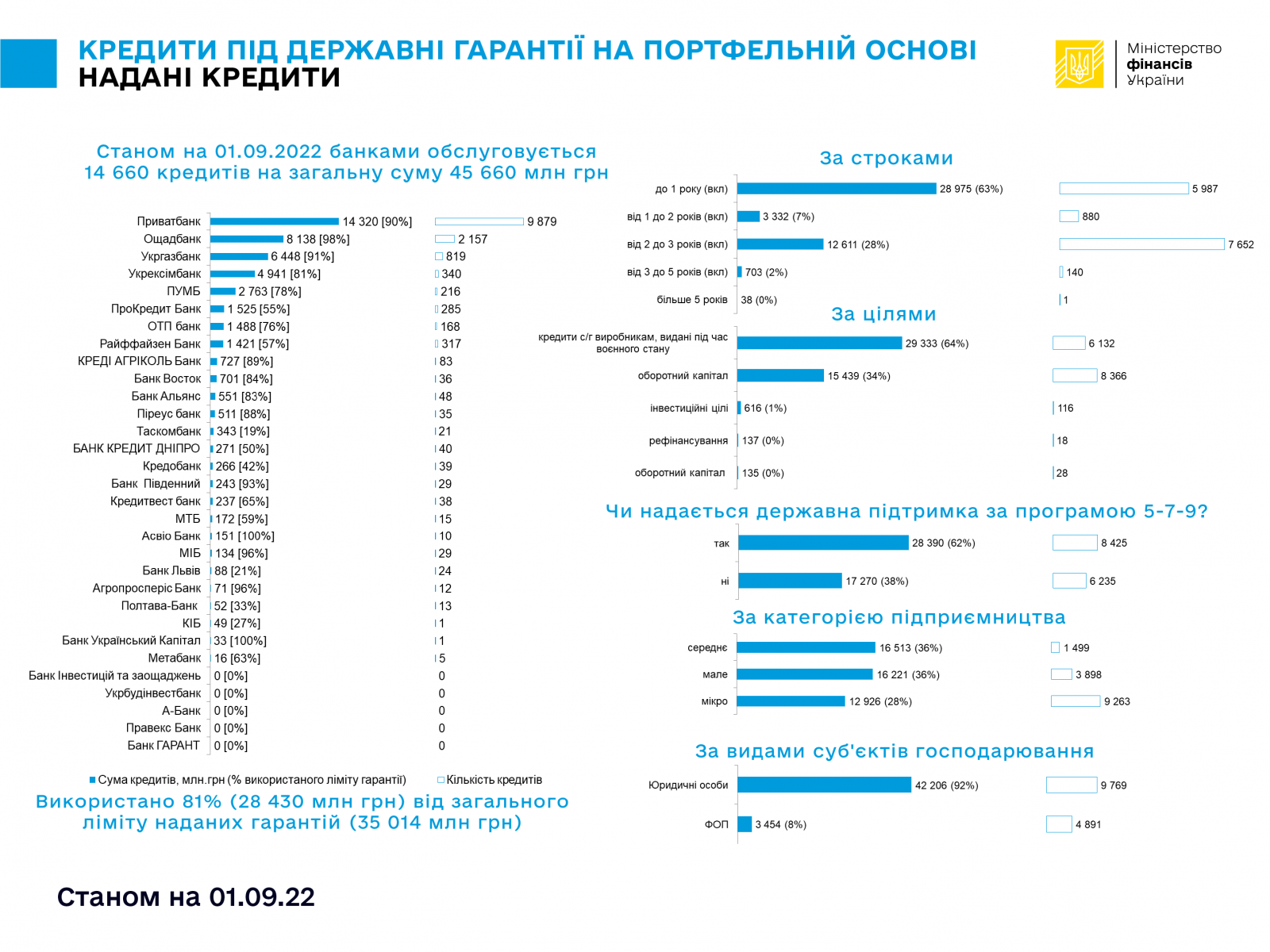Станом на 01 вересня 2022 р. 26 банків-кредиторів обслуговують 14 660 кредитів на суму 45,66 млрд грн. Зобов’язання за основним боргом, що частково забезпечений державними гарантіями на портфельній основі, становили 28,43 млрд грн. Це близько 81% від загального ліміту наданих гарантій (35,014 млрд грн).