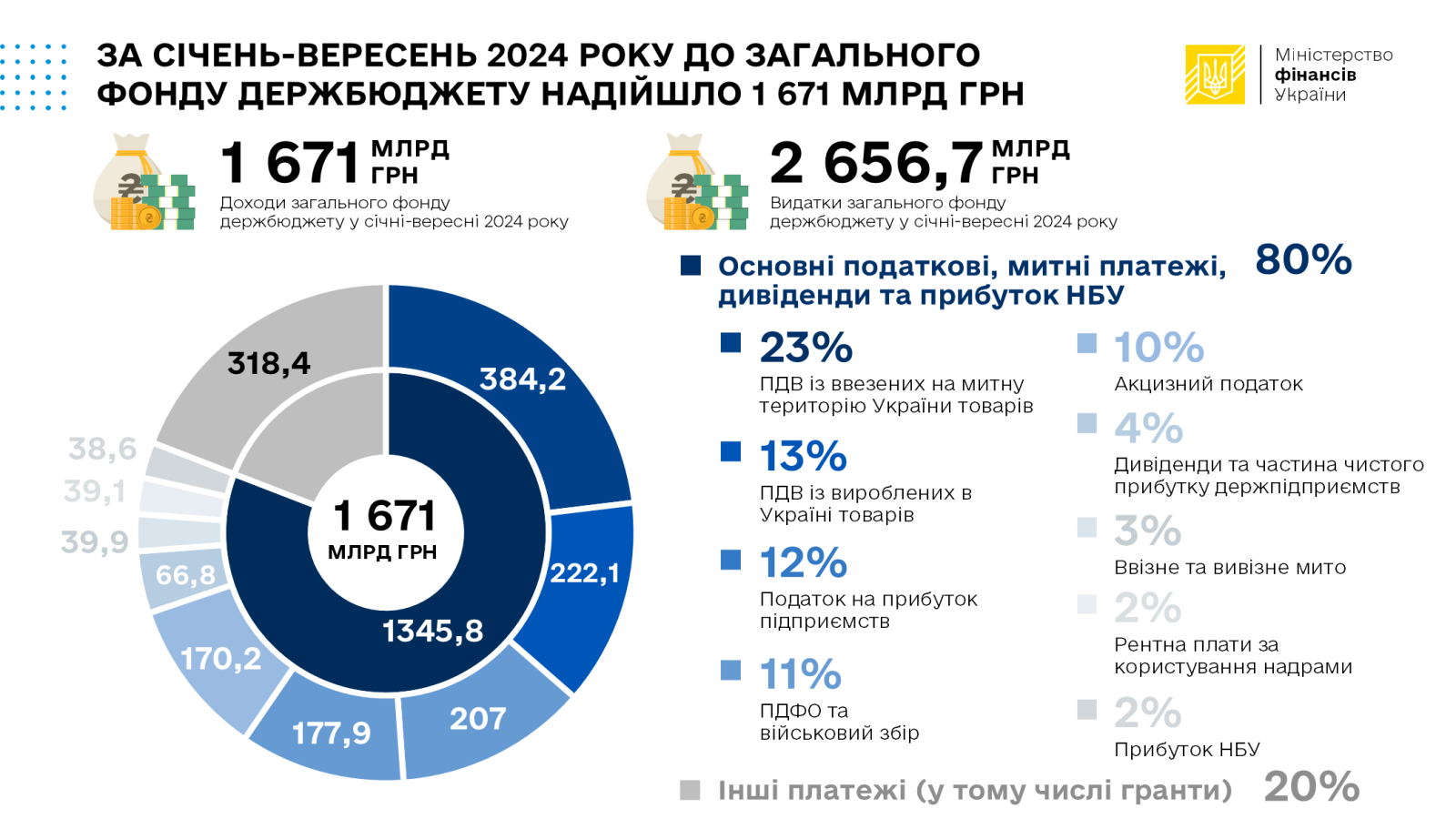 За даними Державної казначейської служби, за січень-жовтень 2024 року до загального фонду державного бюджету надійшло 1 671,0 млрд гривень.