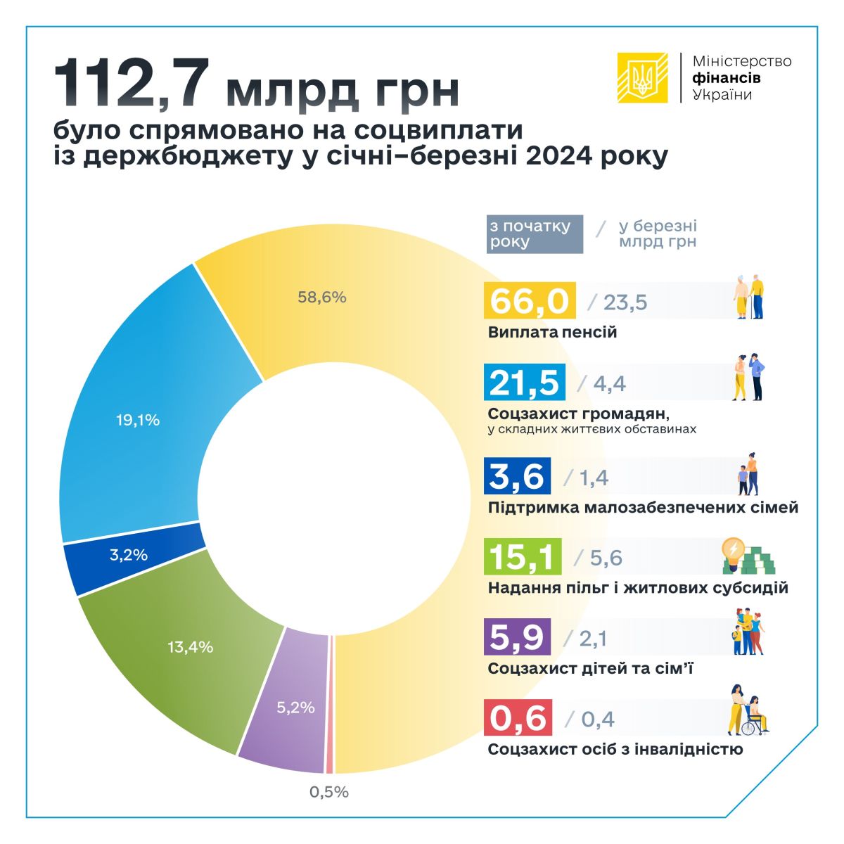 У січні – березні 2024 року із держбюджету на соцвиплати було спрямовано 112,7 млрд грн, зокрема у березні – 37,4 млрд гривень.