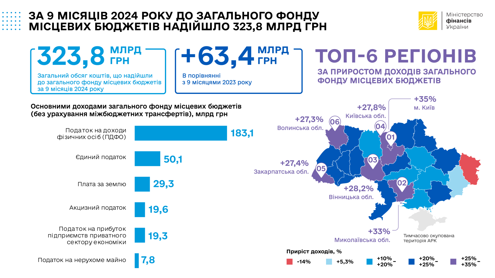 За 9 місяців 2024 року до загального фонду місцевих бюджетів надійшло 323,8 млрд грн, що на 63,4 млрд грн більше ніж за перших 9 місяців 2023 року (у співставних умовах).