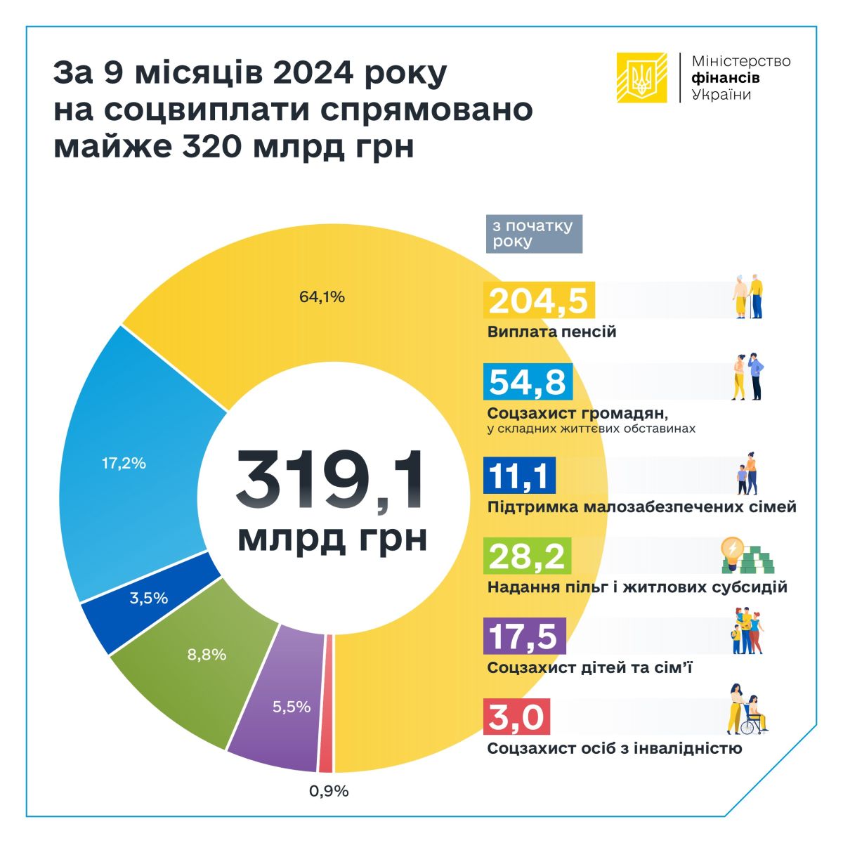 Мінфін: За 9 місяців 2024 року на соцвиплати спрямовано майже 320 млрд грн