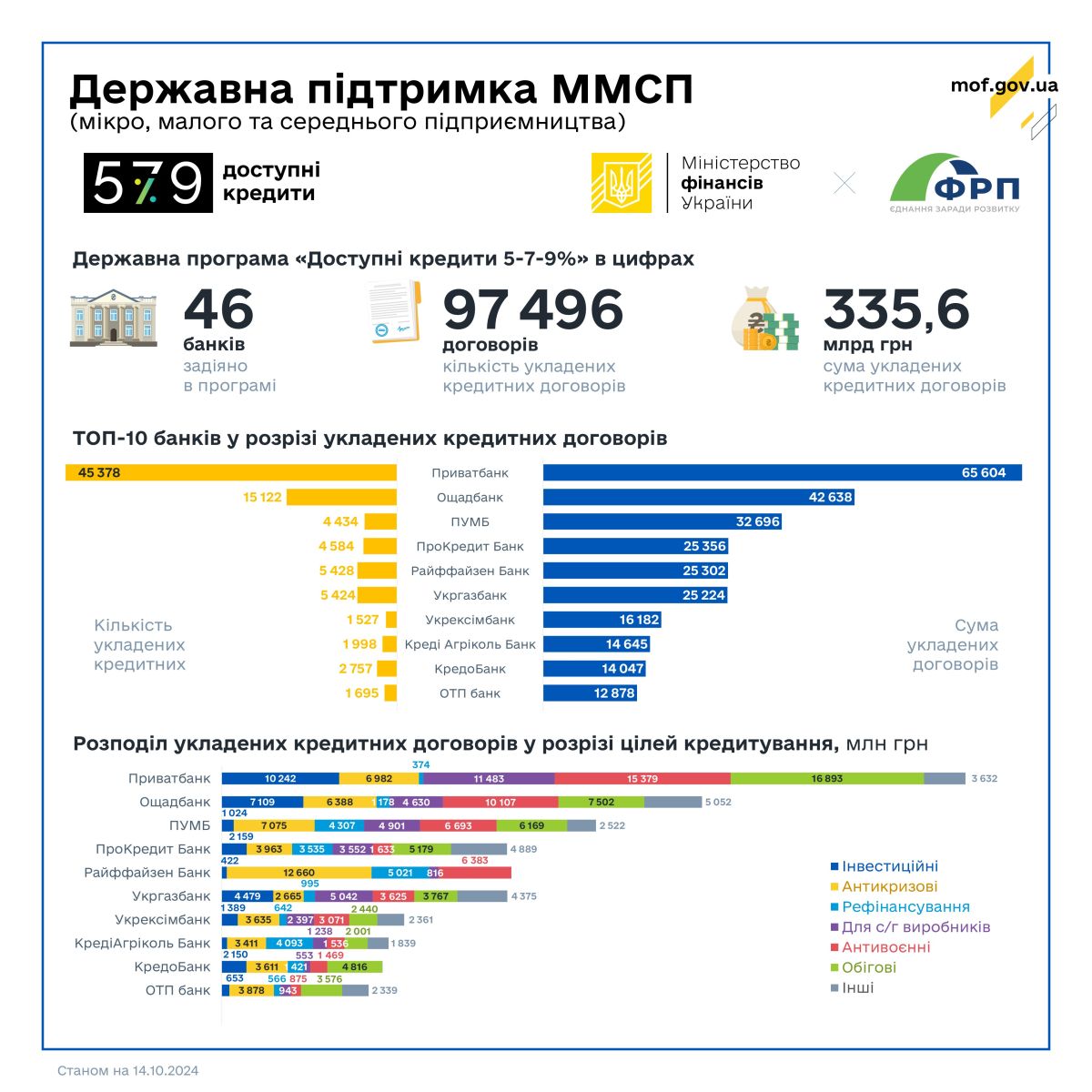 За Державною програмою «Доступні кредити 5-7-9%» ФРП уклав угоди про співробітництво з 46 банками. Держава продовжує здійснювати всі необхідні компенсаційні виплати на користь бізнесу за укладеними кредитними договорами у межах Програми.