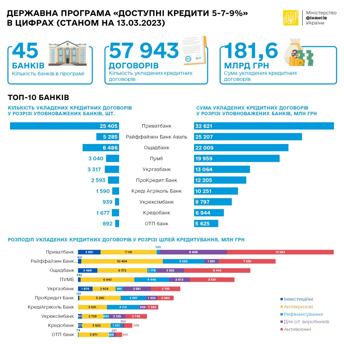 З моменту старту Державної програми «Доступні кредити 5-7-9%» суб’єкти підприємництва отримали від уповноважених банків 57 943 кредити на загальну суму 181,59 млрд грн, з яких 38 147 – від банків державного сектору економіки на загальну суму 76,49 млрд гривень (станом на 13.03.2023 р.).