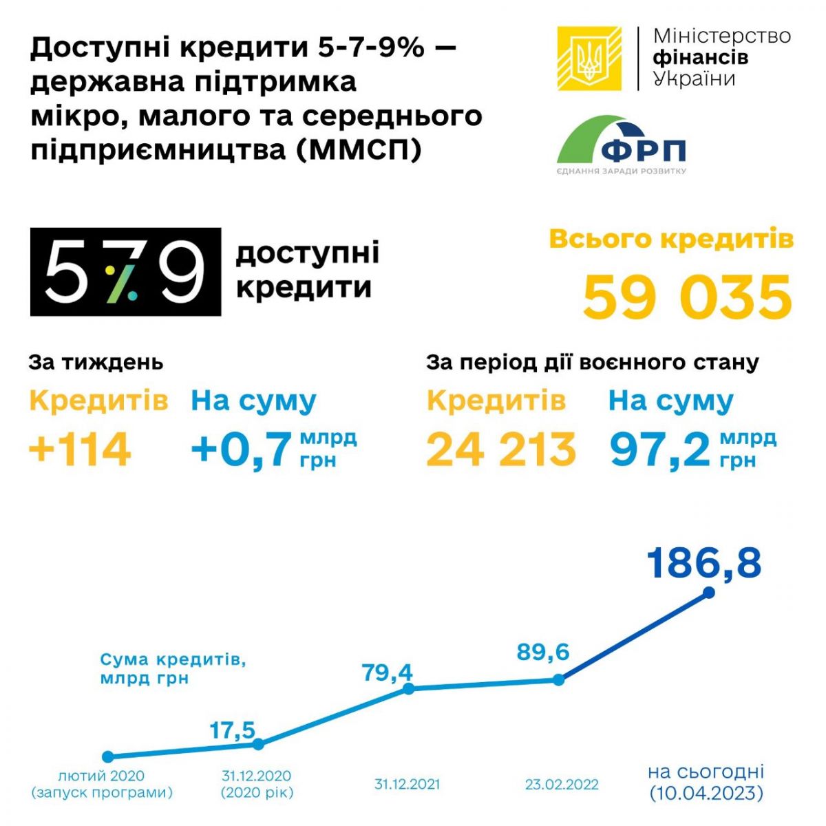 З моменту старту Державної програми «Доступні кредити 5-7-9%» суб’єкти підприємництва отримали від уповноважених банків 59 035 кредитів на загальну суму 186,81 млрд грн, з яких 38 808 – від банків державного сектору економіки на загальну суму 78,95 млрд гривень (станом на 10.04.2023 р.).