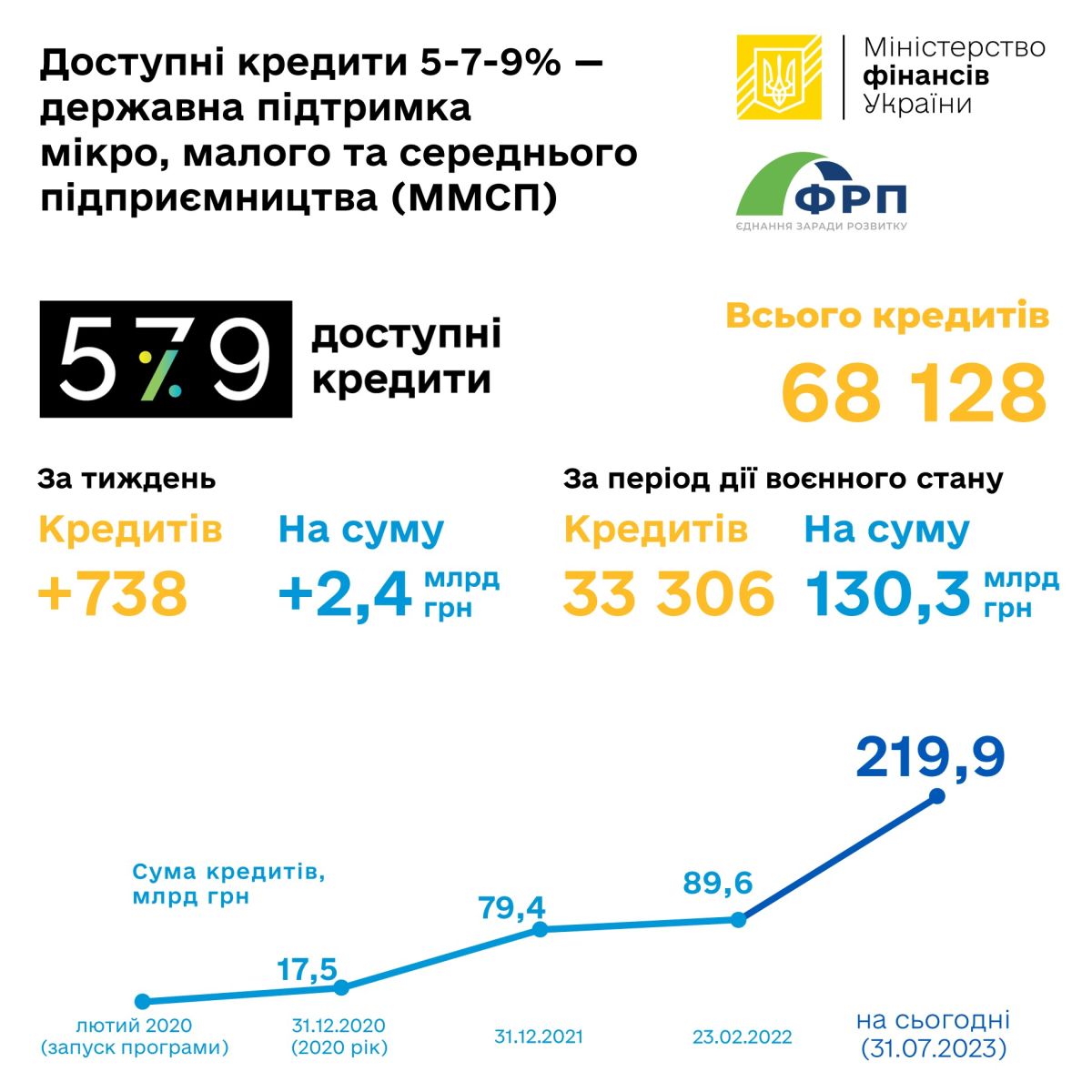 З моменту старту Державної програми «Доступні кредити 5-7-9%» суб’єкти підприємництва отримали від уповноважених банків 68 128 кредитів на загальну суму 219,92 млрд грн, з яких 45 980 – від банків державного сектору економіки на загальну суму 96,97 млрд гривень (станом на 31.07.2023 р.).