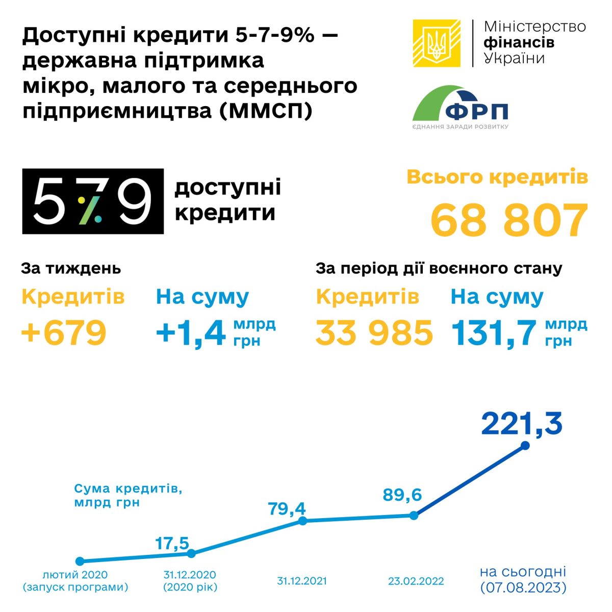З моменту старту Державної програми «Доступні кредити 5-7-9%» суб’єкти підприємництва отримали від уповноважених банків 68 807 кредитів на загальну суму 221,3 млрд грн, з яких 46 554 – від банків державного сектору економіки на загальну суму 97,8 млрд гривень (станом на 07.08.2023 р.).