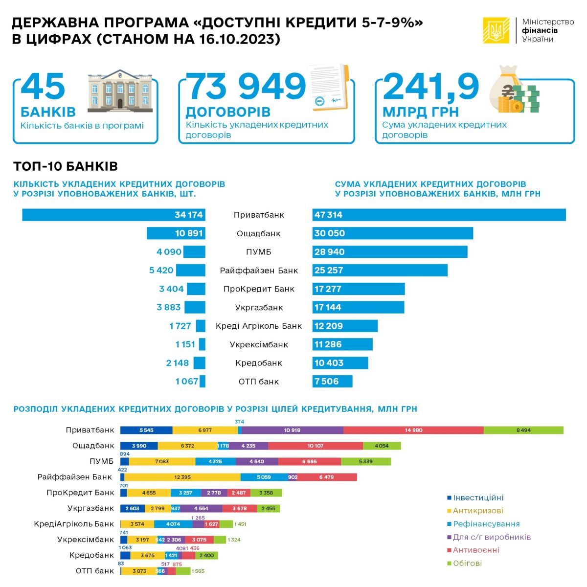 З моменту старту Державної програми «Доступні кредити 5-7-9%» суб’єкти підприємництва отримали від уповноважених банків 73 949 кредитів на загальну суму 241,9 млрд грн, з яких 50 099 – від банків державного сектору економіки на загальну суму 105,8 млрд гривень (станом на 16.10.2023 р.).