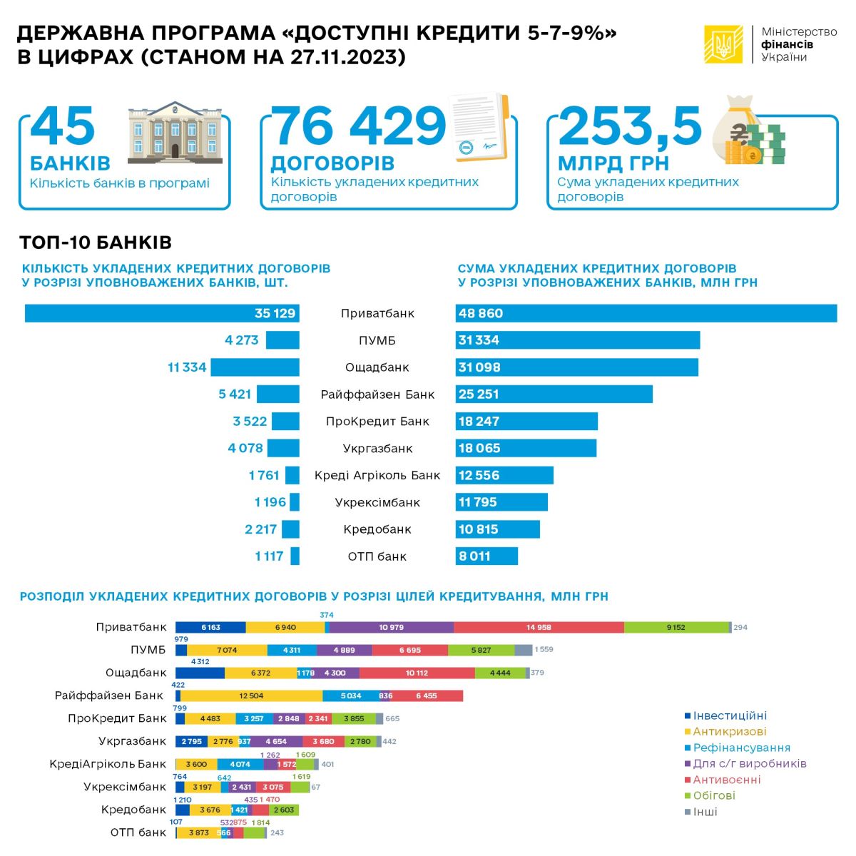 З моменту старту Державної програми «Доступні кредити 5-7-9%» суб’єкти підприємництва отримали від уповноважених банків 76 429 кредитів на загальну суму 253,5 млрд грн, з яких 51 737 – від банків державного сектору економіки на загальну суму 109,8 млрд гривень (станом на 27.11.2023 р.).