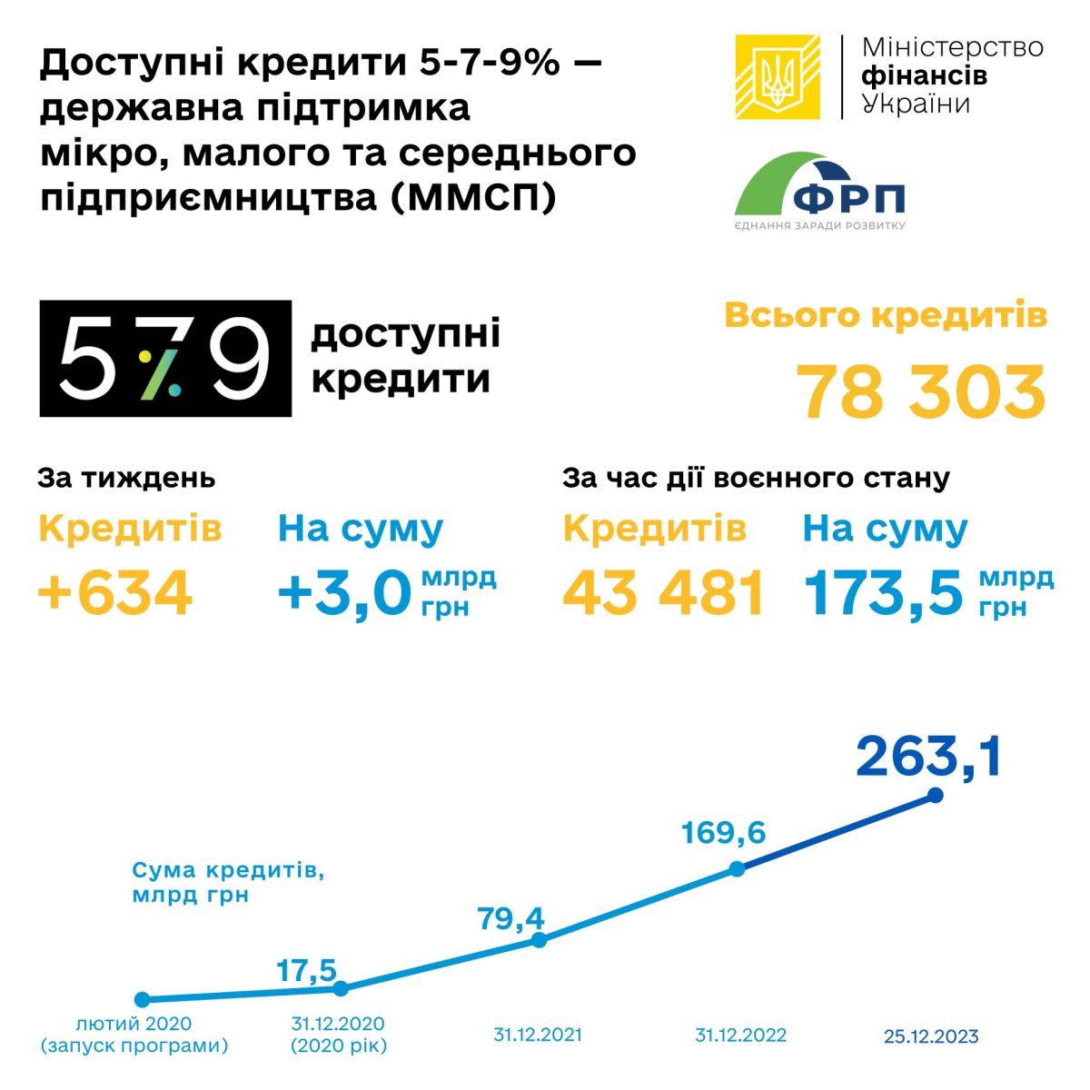 З моменту старту Державної програми «Доступні кредити 5-7-9%» суб’єкти підприємництва отримали від уповноважених банків 78 303 кредити на загальну суму 263,1 млрд грн, з яких 53 013 – від банків державного сектору економіки на загальну суму 114,6 млрд гривень (станом на 25.12.2023 р.).