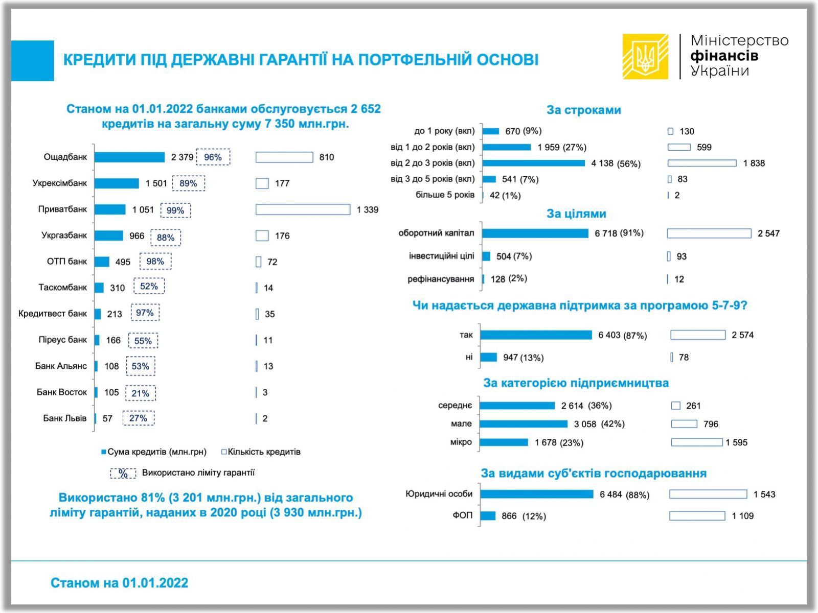 У рамках підтримки мікро, малого та середнього бізнесу в Україні через інструмент державних гарантій на портфельній основі по Програмі 2020 року (№ 1151) станом на 01.01.2022 одинадцятьма банками надано 2652 кредити на загальну суму 7,350 млрд гривень. Зобов’язання за основним боргом, що частково забезпечений державними гарантіями на портфельній основі, становили 3,201 млрд гривень. Це близько 81% від загального ліміту гарантій, наданих у 2020 році (3,930 млрд гривень).