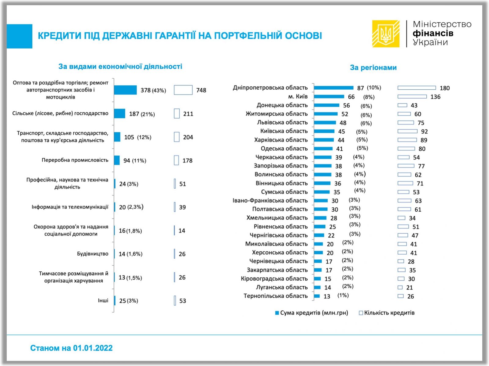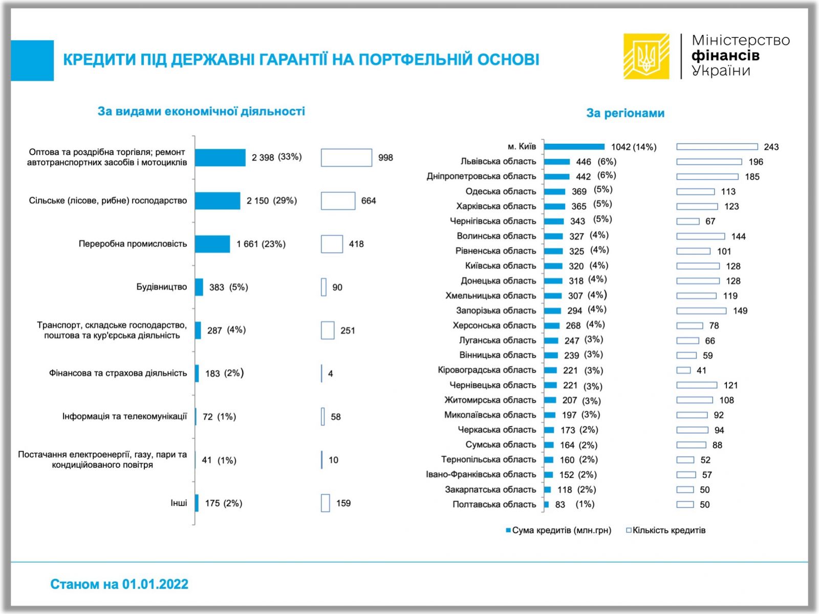За видом економічної діяльності найбільше кредитів, частково забезпечених державними гарантіями на портфельній основі, видавалося у сферах оптової та роздрібної торгівлі (998), на загальну суму 2,398 млрд грн, сільського господарства (664) – на 2,150 млрд грн та переробної промисловості (418) – на 1,661 млрд гривень.