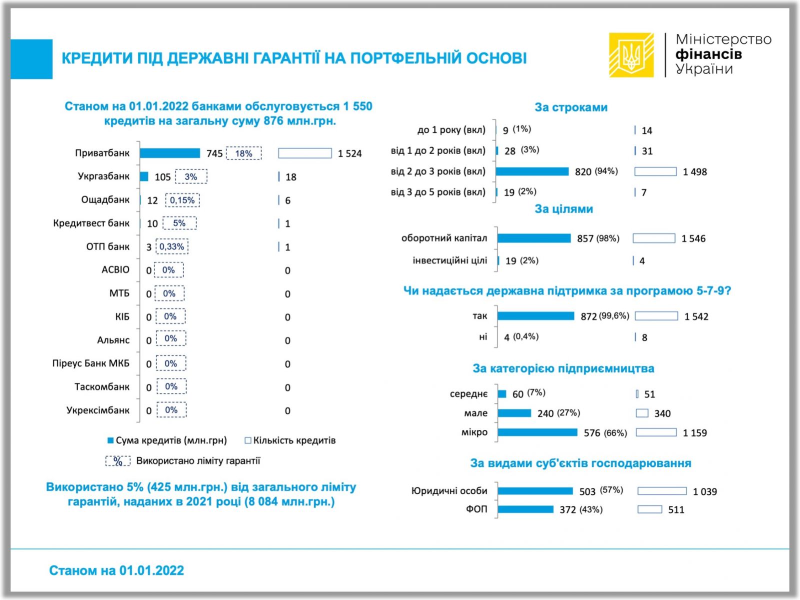Також за Програмою 2021 року (№ 723) станом на 01.01.2022 п’ятьма банками було надано 1550 кредитів на 876 млн грн із зобов’язанням за основним боргом, що частково забезпечений державними гарантіями на портфельній основі, в 425 млн гривень.
