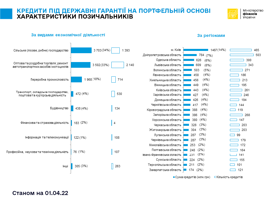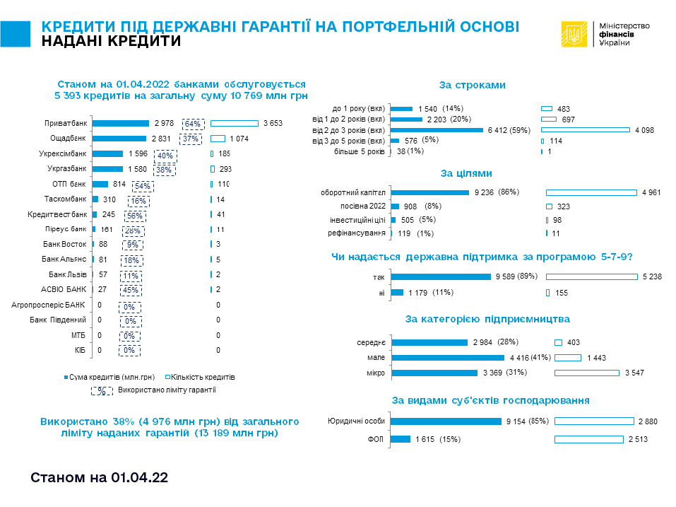 Станом на 01.04.2022 шістнадцять банків-кредиторів обслуговують 5393 кредити на суму 10,769 млрд грн. Зобов’язання за основним боргом, що частково забезпечений державними гарантіями на портфельній основі, становили 4,976 млрд грн. Це близько 38% від загального ліміту наданих гарантій (13,189 млрд грн).