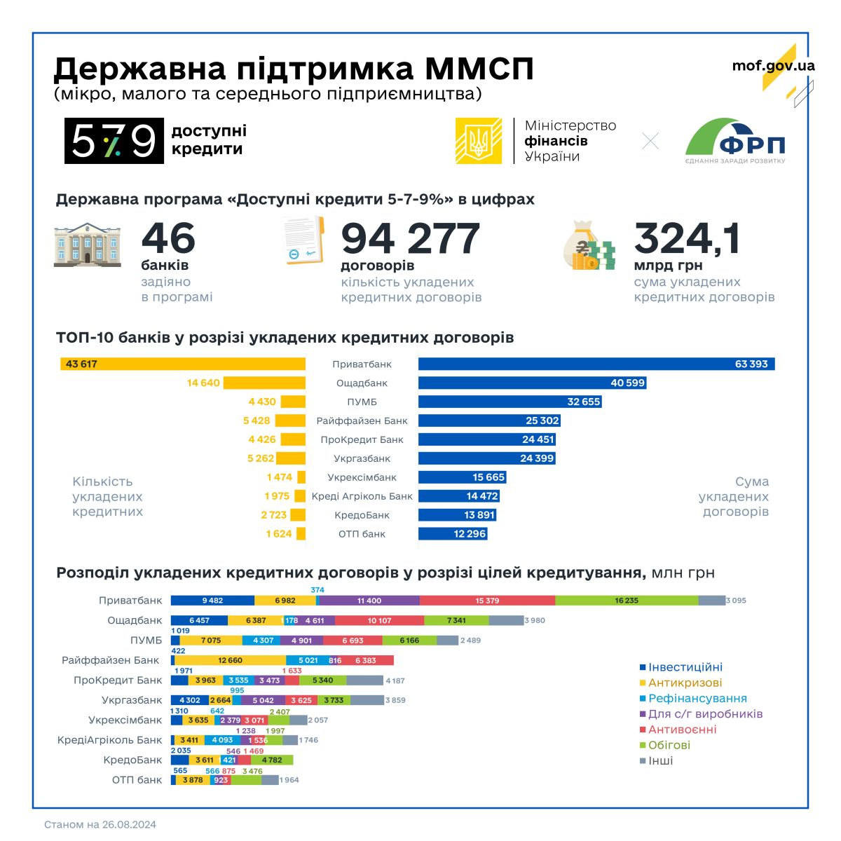 Усього з моменту старту Програми підписано 94 277 кредитних договорів на 324,1 млрд грн, з них банками державного сектору економіки – 65 153 договори на 147,1 млрд гривень.