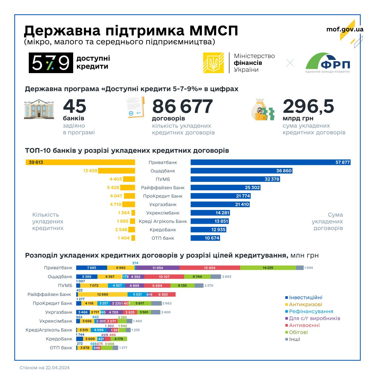 За Державною програмою «Доступні кредити 5-7-9%» ФРП уклав угоди про співробітництво з 45 банками. Держава продовжує здійснювати всі необхідні компенсаційні виплати на користь бізнесу за укладеними кредитними договорами у межах Програми.