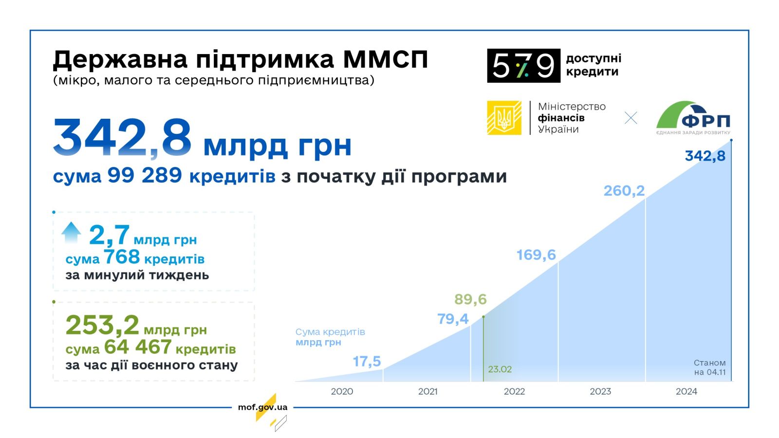 За Державною програмою «Доступні кредити 5-7-9%» ФРП уклав угоди про співробітництво з 46 банками. Держава продовжує здійснювати всі необхідні компенсаційні виплати на користь бізнесу за укладеними кредитними договорами у межах Програми.