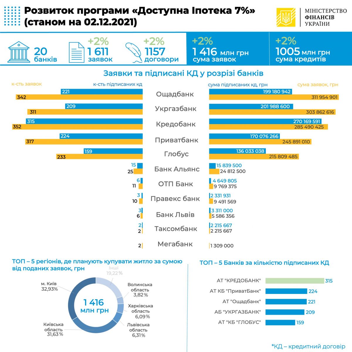 Станом на 02 грудня поточного року уповноваженими банками з виконання Державної програми «Доступна іпотека 7%» підписано 1157 кредитних договорів на загальну суму 1,005 млрд грн як на первинному (24,77%), так і вторинному (відповідно – 75,23%) ринках.