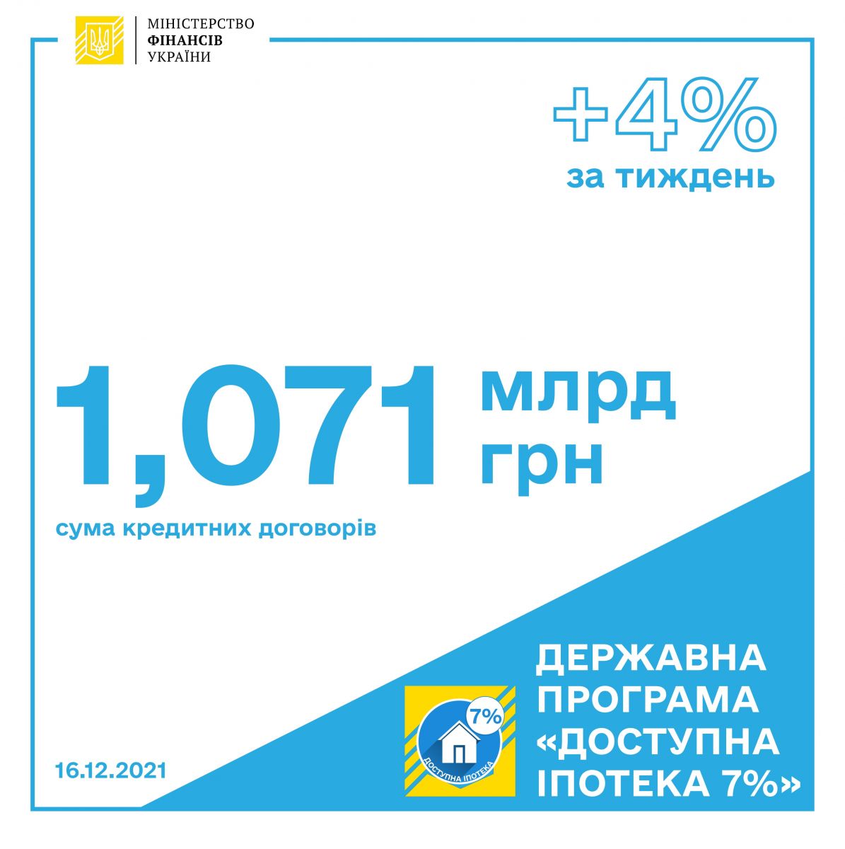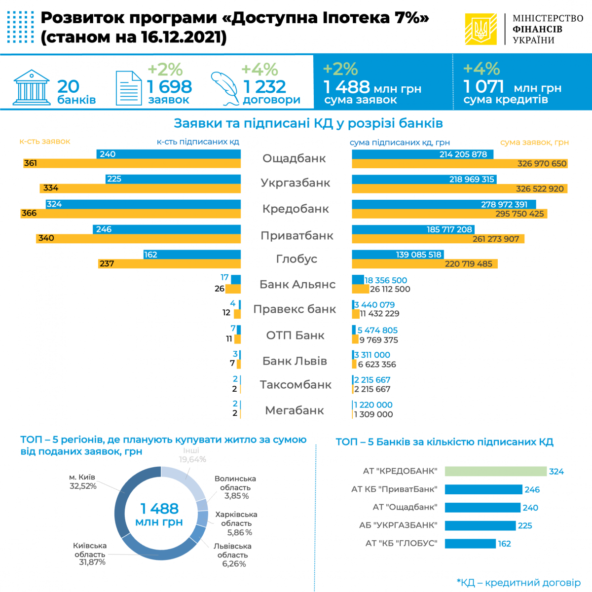 Станом на 16 грудня поточного року уповноваженими банками з виконання Державної програми «Доступна іпотека 7%» підписано 1232 кредитних договорів на загальну суму 1,071 млрд грн як на первинному (24,01%), так і вторинному (відповідно – 75,99%) ринках.