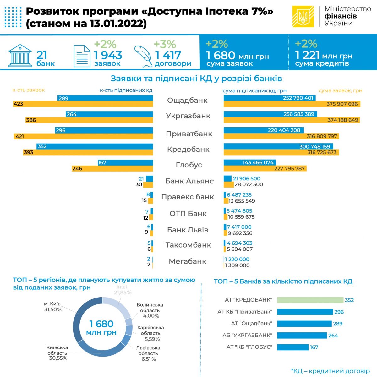 Станом на 13 січня поточного року уповноваженими банками з виконання Державної програми «Доступна іпотека 7%» підписано 1417 кредитних договорів на загальну суму 1,221 млрд грн як на первинному (22,39%), так і вторинному (відповідно – 77,61%) ринках.