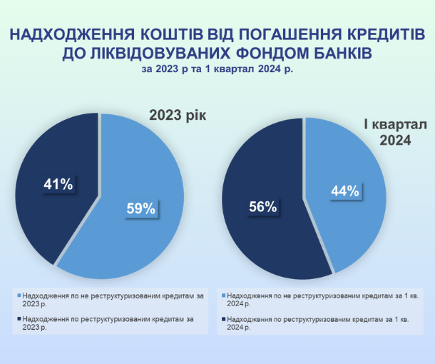 При цьому частка надходжень за реструктуризованими кредитами зростає. У 2023 році вона становила 41% від суми всіх надходжень за кредитами, а за результатами І кварталу поточного року вже перевищила 56%.