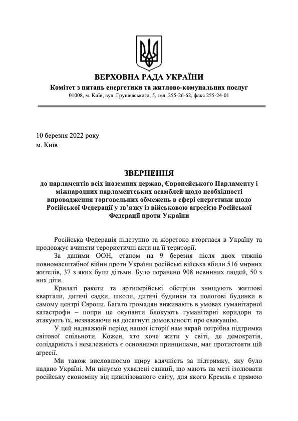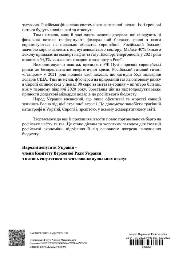 Народні депутати - члени Комітету з питань енергетики та ЖКП вимагають ввести ембарго на російську нафту та газ.