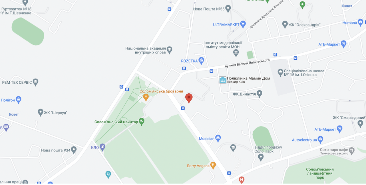 Приміщення знаходиться у житловому масиві Солом’янка. Поблизу розташовані ресторани, паби, зокрема відома у Солом’янському районі Солом’янська броварня, парк Миколи Зерова та кілька закладів освіти. Сусідство із житловим комплексом створює прекрасні можливості для відкриття офісного приміщення з надання послуг чи розміщення торгової точки.