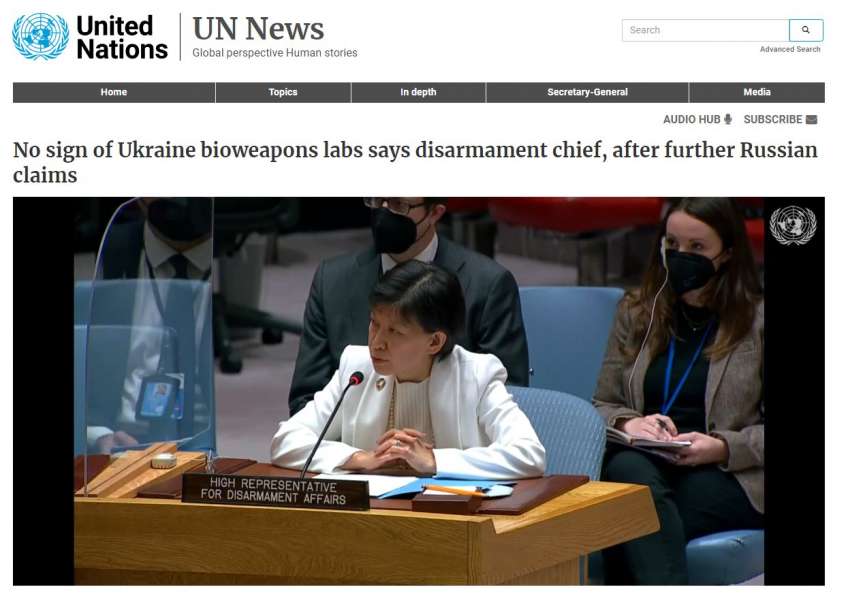 "Організацїї Об'єднаних Націй нічого не відомо про будь-які програми біологічної зброї в Україні», – наголосила на засіданні Ради Безпеки ООН Заступниця Генсека ООН, Верховний представник з питань роззброєння Ідзумі Накаміцу.