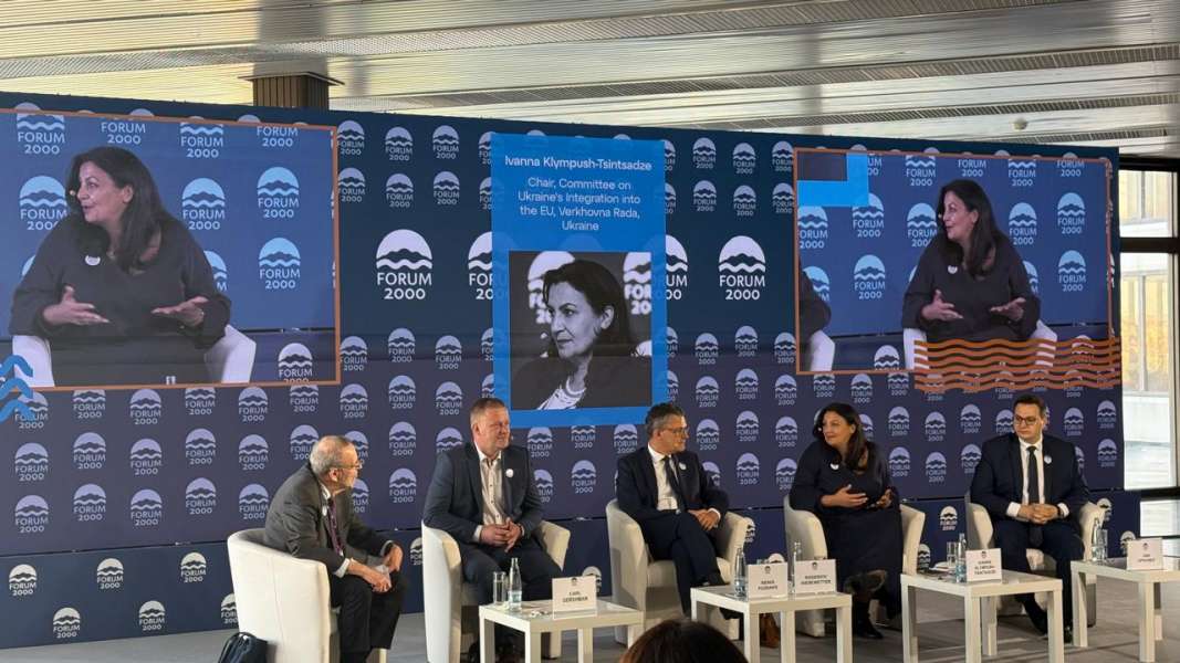Голова Комітету з питань інтеграції України до ЄС Іванна Климпуш-Цинцадзе та перший заступник голови Комітету Вадим Галайчук взяли участь у роботі “Форуму 2000”, який щороку відбувається у Празі. “Форум 2000” - це міжнародний майданчик, який вже понад чверть століття об’єднує лідерів думок, дипломатів, політиків та представників громадянського суспільства для обговорення майбутнього демократії та глобальної безпеки. Цього року захід зібрав понад 750 учасників з більш, як ста країн світу. Тут були фахівці із Південної Америки, Африки, Азії, що, за словами Іванни Климпуш-Цинцадзе та Вадима Галайчука, дало змогу в ширшому контексті сформулювати цілі та загрози, з якими стикається Україна та Європа, а також краще зрозуміти глобальні акценти і виклики, які постають перед суспільствами в інших регіонах. “Для нас принципово важливо, що на форумі є взагалі окремий трек, так званий “український форум”, який глибше аналізує процеси пов'язані з нашими безпековими викликали, оборонним потребами, демократичною трансформацією і європейською інтеграцією”, - зазначила Іванна Климпуш-Цинцадзе.