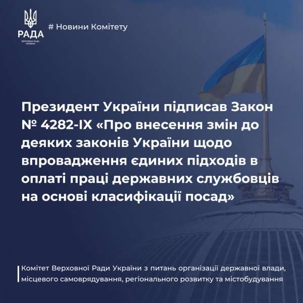 Президент України підписав Закон №4282-ІХ "Про внесення змін до деяких законів України щодо провадження єдиних підходів в оплаті праці державних службовців на основі класифікації посад"