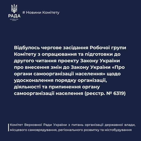 16 жовтня 2025 року в режимі відеоконференції на платформі ZOOM. Робоча група Комітету з опрацювання та підготовки до другого читання проекту Закону України про внесення змін до Закону України «Про органи самоорганізації населення» щодо удосконалення порядку організації, діяльності та припинення органу самоорганізації населення (реєстр. №6319) провела чергове засідання, під час якого обговорила положення відповідного законопроекту та внесені суб’єктами права законодавчої ініціативи поправки і пропозиції щодо переліку та порядку надання повноважень органу самоорганізації населення, фінансової і матеріальної основи його діяльності.
