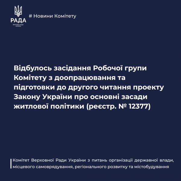 8 серпня 2025 року в режимі відеоконференції за участі народних депутатів, представників центральних органів виконавчої влади, органів місцевого самоврядування, проектів міжнародної технічної допомоги, всеукраїнських асоціацій органів місцевого самоврядування та експертного середовища відбулось перше засідання Робочої групи Комітету з доопрацювання та підготовки до другого читання проекту Закону України про основні засади житлової політики (реєстр. №12377).