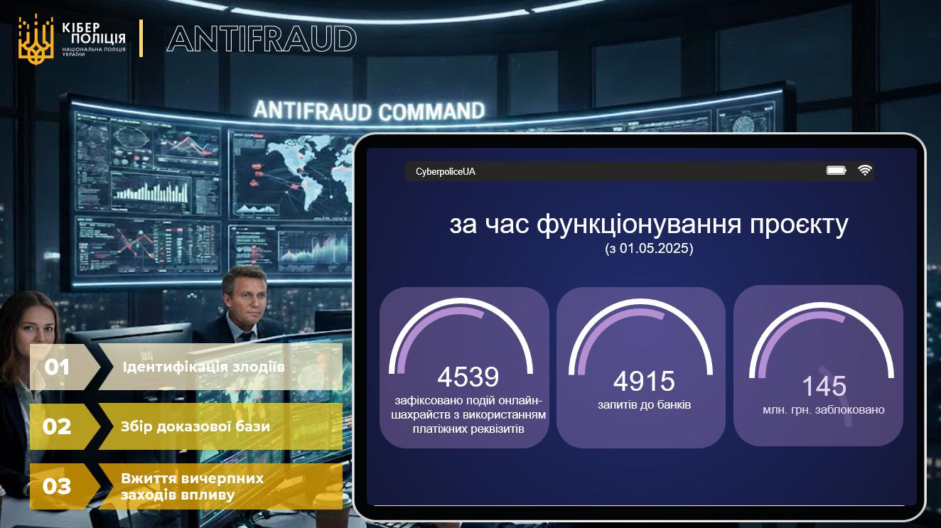 Упродовж функціонування проєкту (з 01.05.2025) у системі зареєстровано 4 539 подій онлайн-шахрайств з використанням платіжних реквізитів, за яким сформовано 4 915 запитів до банківських установ.