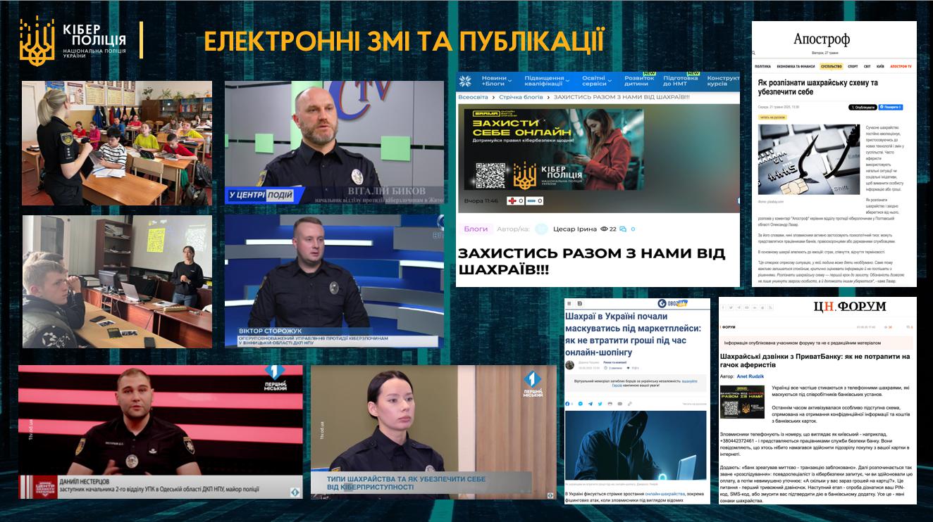 Одночасно із цим, у 2025 році продовжено заходи щодо зменшення впливу широкого спектру загроз у кіберпросторі на суспільство України шляхом надання порад із медіаграмотності, кібербезпеки і кібергігієни, популяризація безпечної поведінки українців в мережі Інтернет і формування навичок критичного мислення для самостійного виявлення фейків та підвищення стійкості до маніпуляцій та пропаганди. Як складову цього профілактичного контуру Департамент кіберполіції забезпечив розвиток вебпорталу «Кібер Брама» на домені gov.ua (https://stopfraud.gov.ua), зокрема з розділом «Кібербезпека під час війни», що містить практичні поради для громадян.