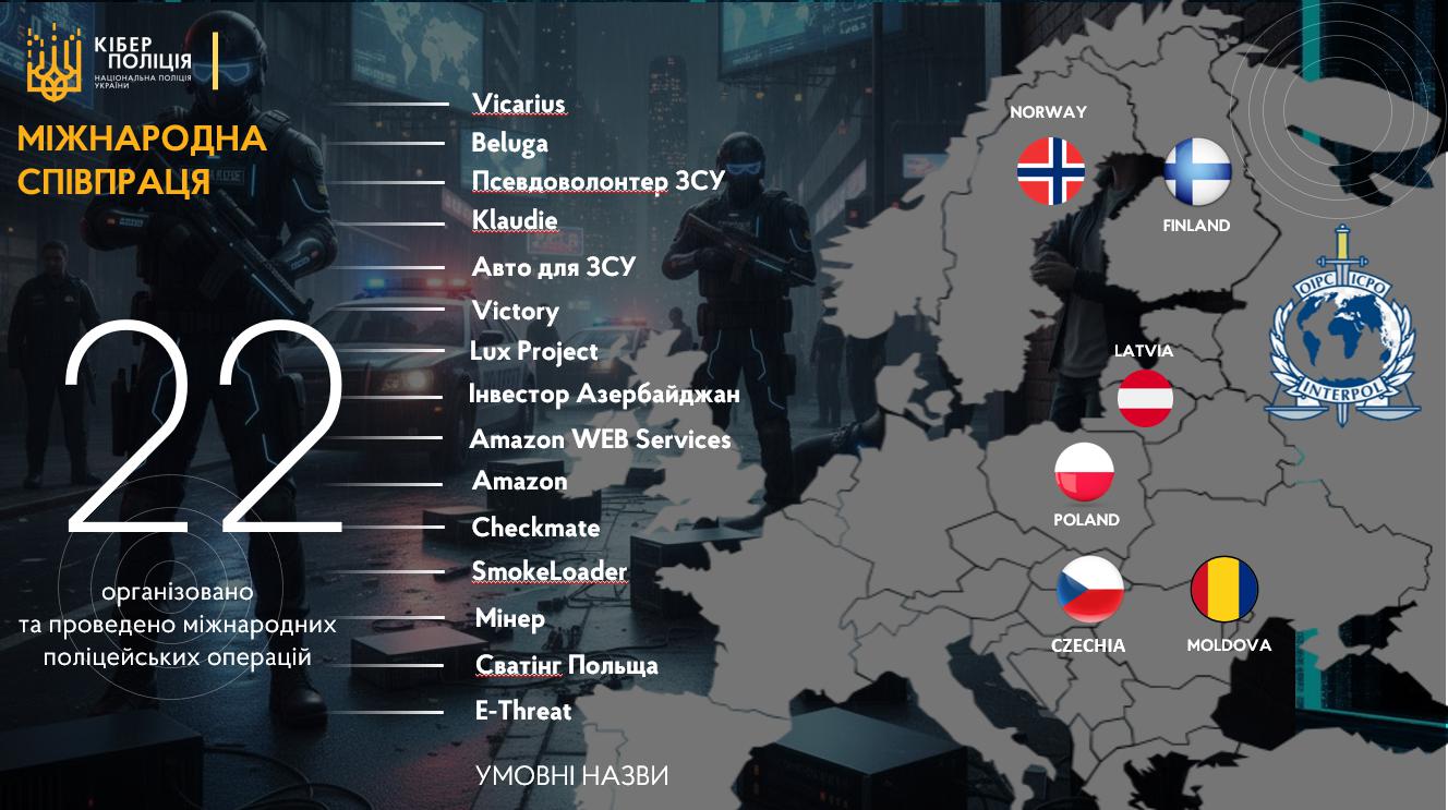 Спільно з іноземними колегами українські поліцейські ініціювали та забезпечили участь у проведенні 22 міжнародних поліцейських операцій (у 2024 – 17). У результаті було нейтралізовано загрозу з боку кількох потужних хакерських об’єднань, злочинна діяльність яких охоплювала країни всього світу.