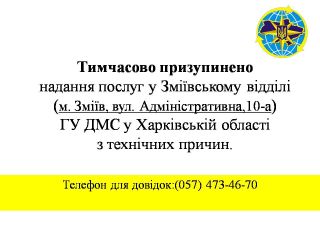 Інформуємо мешканців, що у Зміївському відділі ГУ ДМС у Харківській області (м. Зміїв, вул. Адміністративна, 10-а) тимчасово призупинено надання послуг з технічних причин.