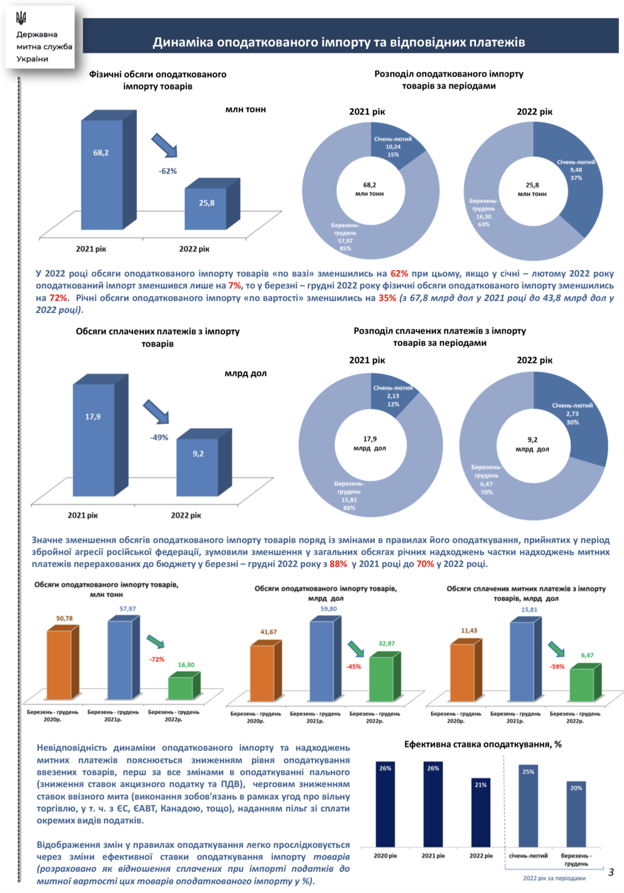 Зокрема, обсяги оподаткованого імпорту товарів у 2022 році, у порівнянні з 2021 роком, скоротились на більш ніж у 2,7 рази (з 68,2 млн тонн у 2021 році до 25,8 млн тонн у 2022 році).
