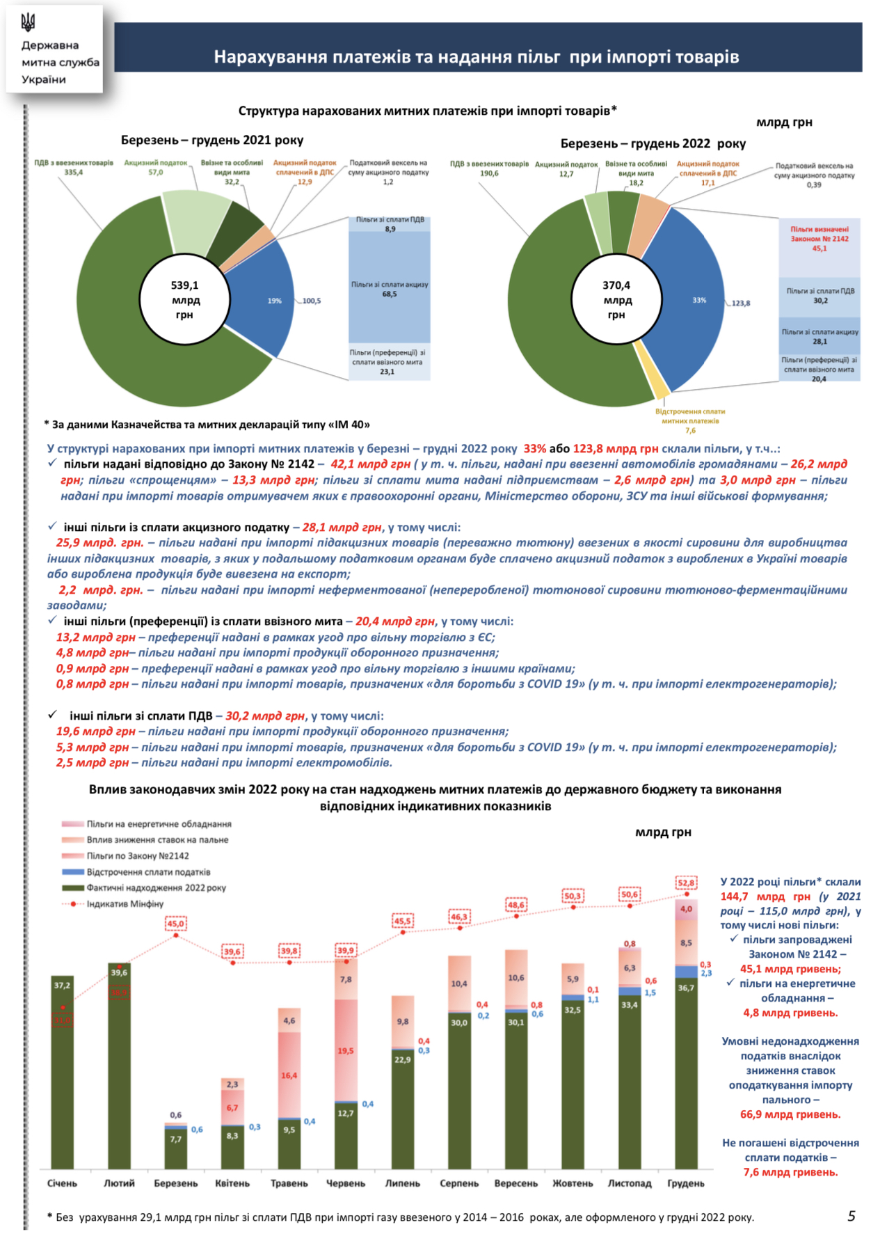 нові пільги, спрямовані на відновлення енергосистем та забезпечення громадян електроенергією – лише протягом листопада – грудня 2022 року обсяги наданих пільг склали 4,8 млрд грн, у тому числі з імпорту електрогенераторів – 3,8 млрд грн;